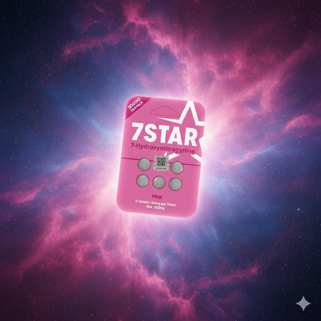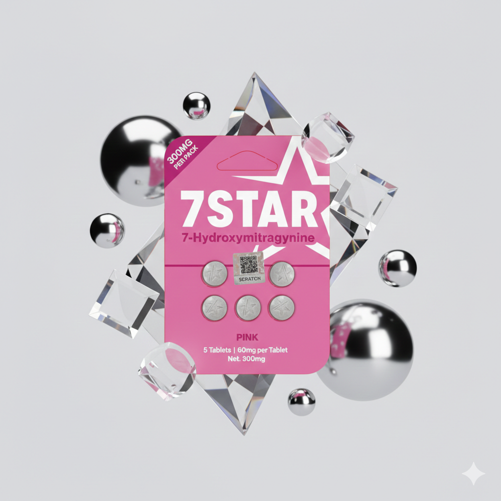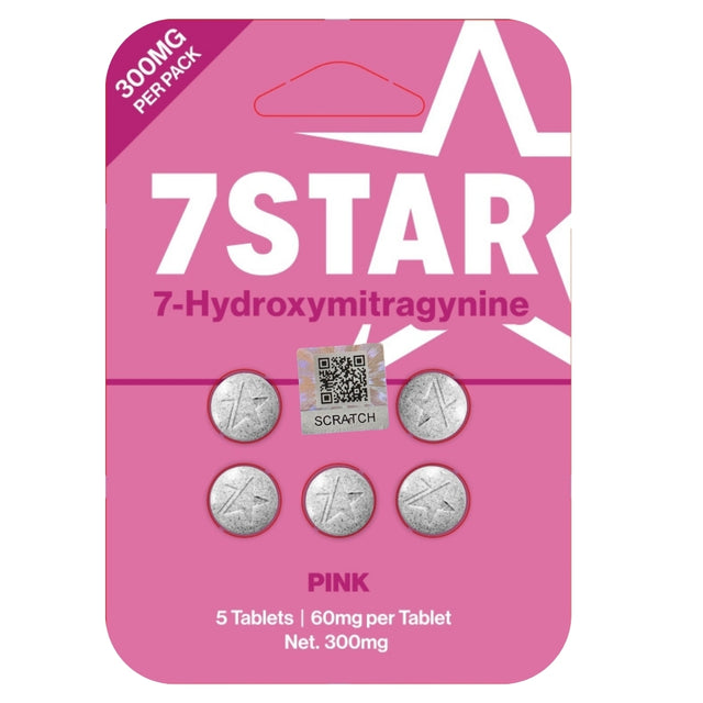The 7STAR Pink 7-Hydroxymitragynine 60mg variation provides the same consistent 7STAR formula in a sleek pink blister pack. Each tablet contains 60mg, with 5 tablets per blister (300mg total).
